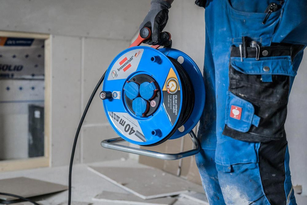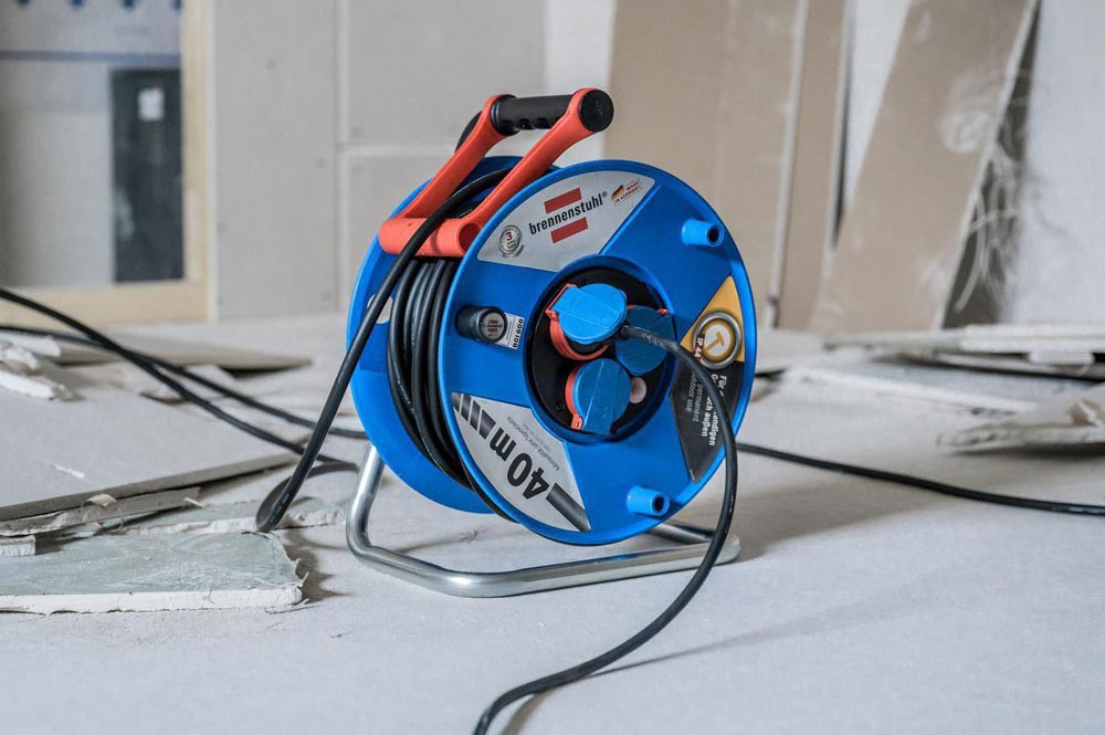 spritzwassergeschützt · aus Spezialkunststoff · stabiles, verzinktes Tragegestell · innovativer Tragegriff "cablepilot" für perfekte Kabelführung · pendelt auf beiden Seiten und ermöglicht bequemes Tragen und Aufhängen · mit Drehgriff für komfortables Aufrollen · 3 Schutzkontakt-Steckdosen mit selbstschließenden Deckeln · Überhitzungsschutz · Kontrollleuchten bei Überhitzung und Überlastung · gemäß BGI 608 K2 · Gummikabel H07RN-F