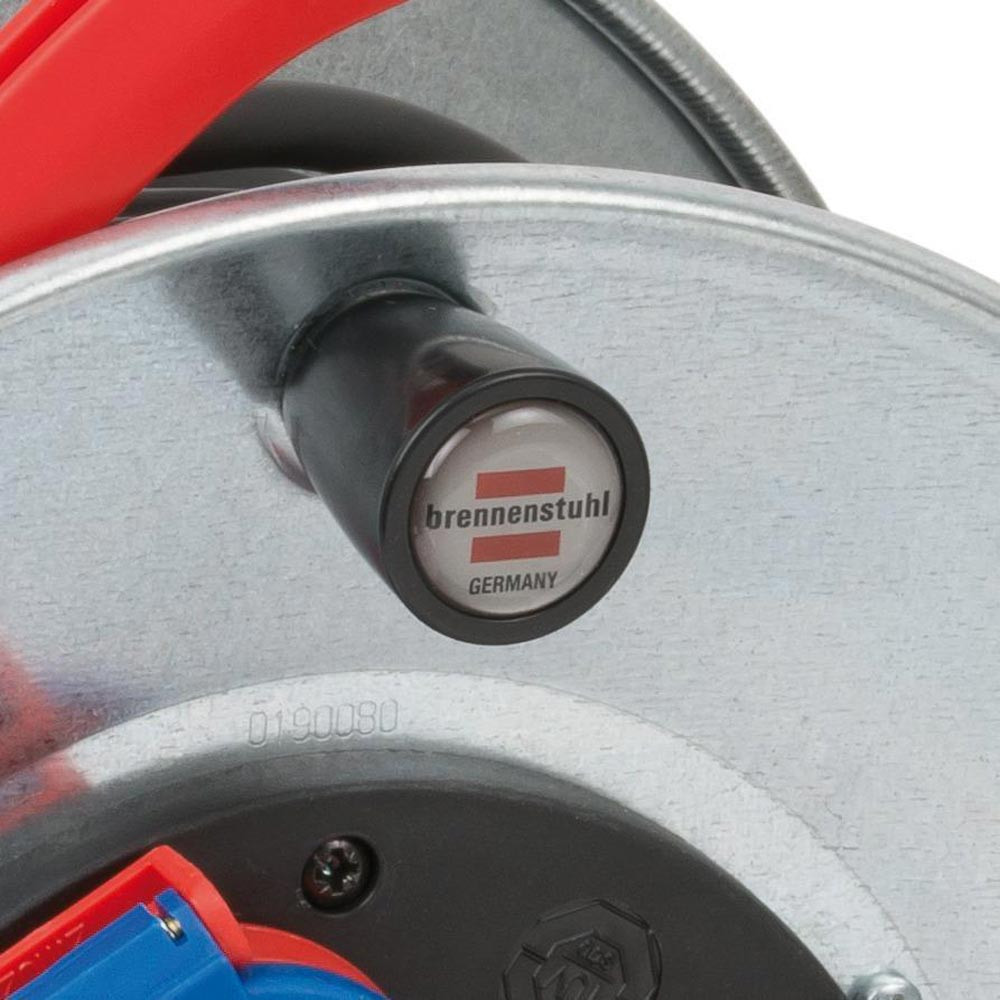 aus verzinktem Stahlblech · besonders standfester und stabiler Stahlrohrrahmen · innovativer Tragegriff "cablepilot" für perfekte Kabelführung · pendelt auf beiden Seiten und ermöglicht bequemes Tragen und Aufhängen · mit Drehgriff für komfortables Aufrollen · 3 Schutzkontakt-Steckdosen, spritzwassergeschützt, mit selbstschließenden Deckeln · Überhitzungsschutz, Kontrollleuchte bei Überhitzung und Überlastung · · Gummikabel AT-N05V3V3-F 3G1,5 für die kurzzeitige Verwendung im Freien