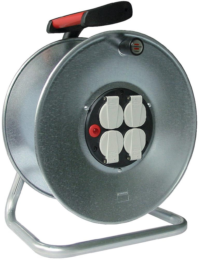 Trommelkörper aus verzinktem Stahlblech auf besonders stabilem Tragegestell · 4 Schutzkontaktsteckdosen 230 V mit selbstschließenden Klappdeckeln · mit Überhitzungsschutz und Kontrollleuchte · Schutzart IP44
