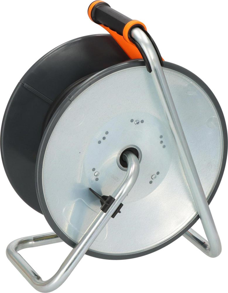 spritzwassergeschützt · mit 4 Schutzkontakt-Steckdosen, mit selbstschließenden Deckeln) und extra robustem Schutzkontakt-Stecker · Trommelkörper aus Stahlblech, Vorder- und Rückseite schutzisoliert · innovativer Tragegriff "cablepilot" für perfekte Kabelführung · großer, stabiler Klapp-Drehgriff · Trommelkörper kälteschlagbeständig bis -25 °C · unempfindlich gegen Benzine und Öle · robustes, ölbeständiges RN-Kabel · Überhitzungsschutz bei Überhitzung und Überlastung · mit optischer Bereitschaftsanzeige im Steckdoseneinsatz · Schutzart: IP44 · Kabelfarbe: schwarz · gemäß BGI 608 K2 · Gummikabel H07RN-F