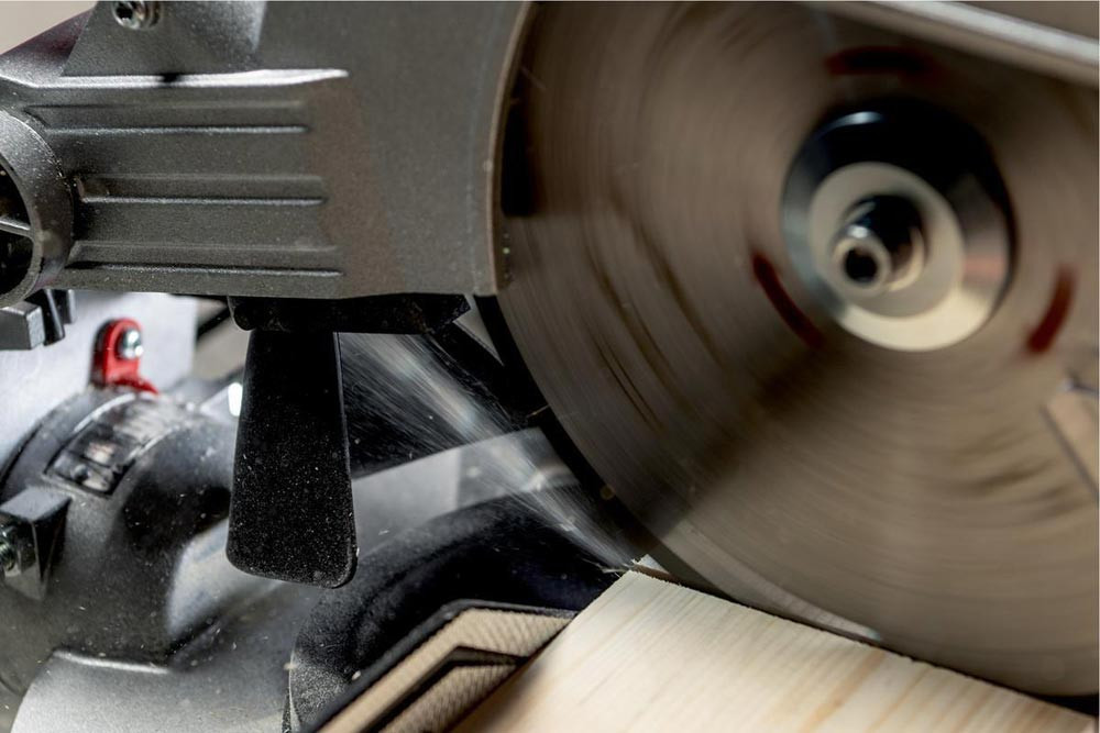 Lieferumfang: 2 HM-Sägeblätter WZ-40, 2 integrierte Tischverbreiterungen, Ablänganschlag, Materialklemme, Werkzeug für Sägeblattwechsel, Spänefangsack