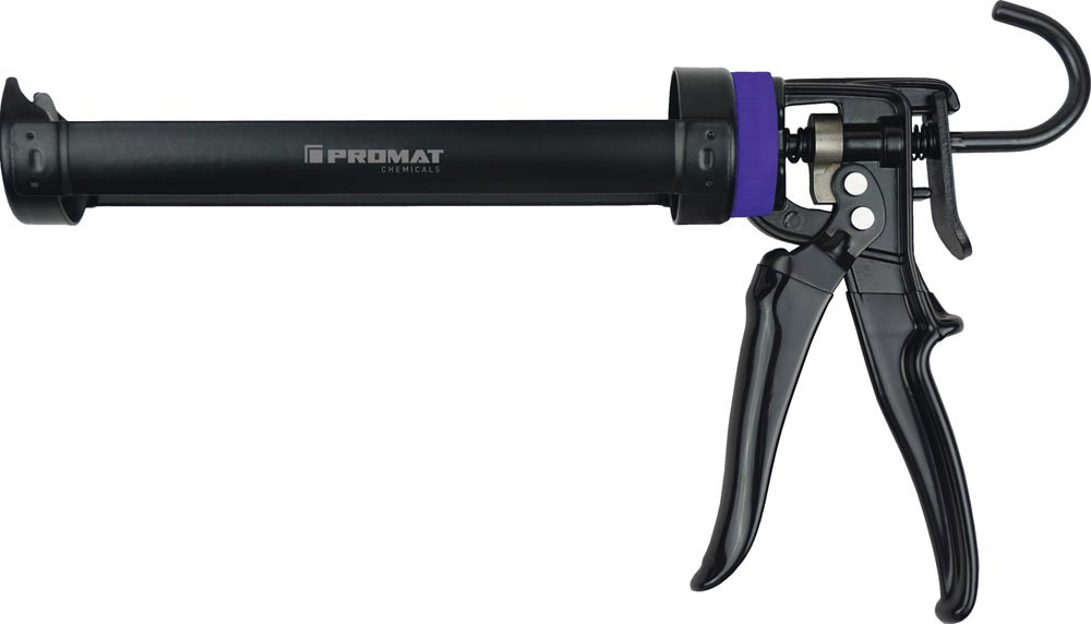 stabiles Profi-Werkzeug mit drehbarer Schale und extra starkem Schubklotz, gummiertem, abrutschsicherem Griff und Abzug · Schub- und Antriebsteile mit korrosionsgeschützter Speziallegierung · Übersetzungsverhältnis 17:1 · integrierter Leiterhaken · auch für zähe Massen geeignet · für alle genormten Kartuschen (310 ml)