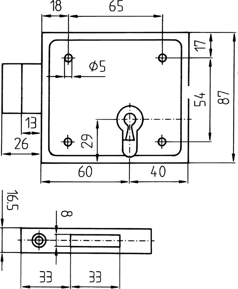 zum Aufschrauben · 2-tourig · Dornmaß 60 mm · mit Flachschließblech 23 x 75 mm · Breite 100 mm x Höhe 87 mm x Tiefe 16,5 mm · DIN links/rechts verwendbar · mit 2 Schlüsseln und Schlüsselschild