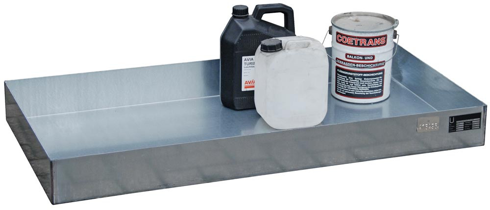 Kleingebindewannen aus verzinktem Stahlblech für Paletten, BxTxH 600x1200x120 mm, Auffangvolumen 60 l, Traglast 200 kg, Gewicht 27 kg