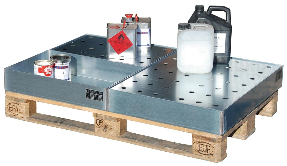∙ Wahlweise aus 3 mm verzinktem Stahlblech oder aus 2 mm Edelstahl zur Lagerung von aggressiven Medien ∙ Wannen passen genau auf Euro- oder Chemiepaletten ∙ Mit und ohne Lochrost erhältlich