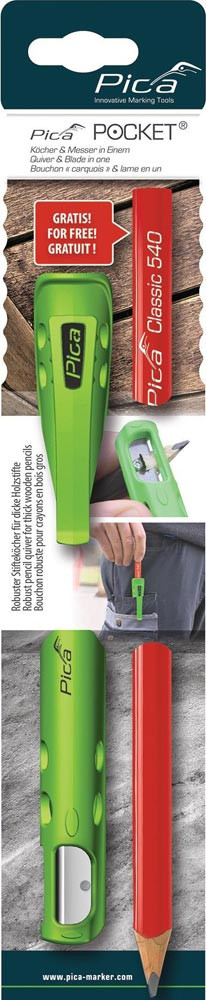 für Bleistifte · hält alle dicken Holzstifte wie z. B. Zimmermanns-/ Steinhauerstifte, egal ob oval, flachoval, dreikant · oder sechskantig · sogar den kleinsten Stummel · integriertes Spitzmesser · Taschenclip · mit extrem starkem Halt