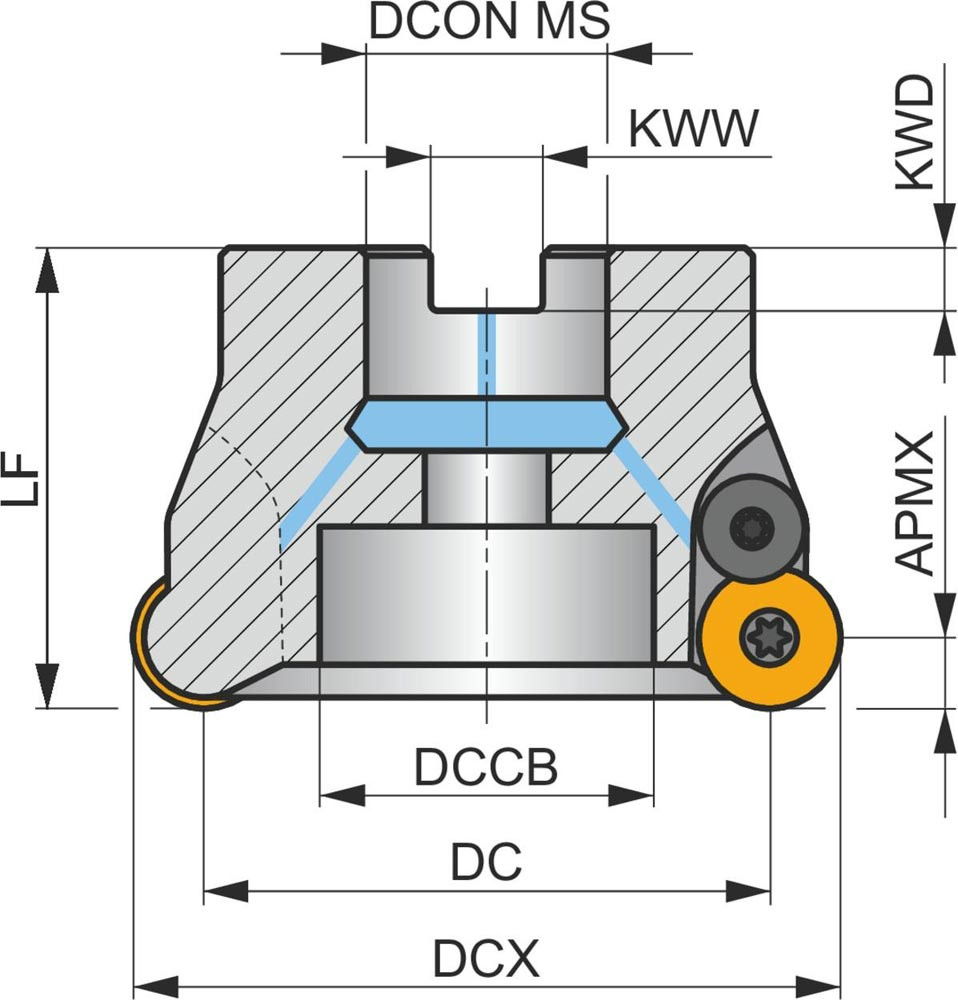 Plan-Kopierfräser mit positv/negativer Geometrie welche 7 aus RD.. 1604MOT oder RDHT 1604MO-FA einseitige Wendeschneidplatte · Schneiddurchmesser bis maximal 100mm mit 32mm Bohrung gemäß DIN 8030-A · 52mm funktional und · durchgehende Kühlung zum Planfräsen · Kopierfräsen · Rampen · progressiven Tauchfräsen und helikalen Fräsen mit einer maximalen Schnitttiefe von 4mm