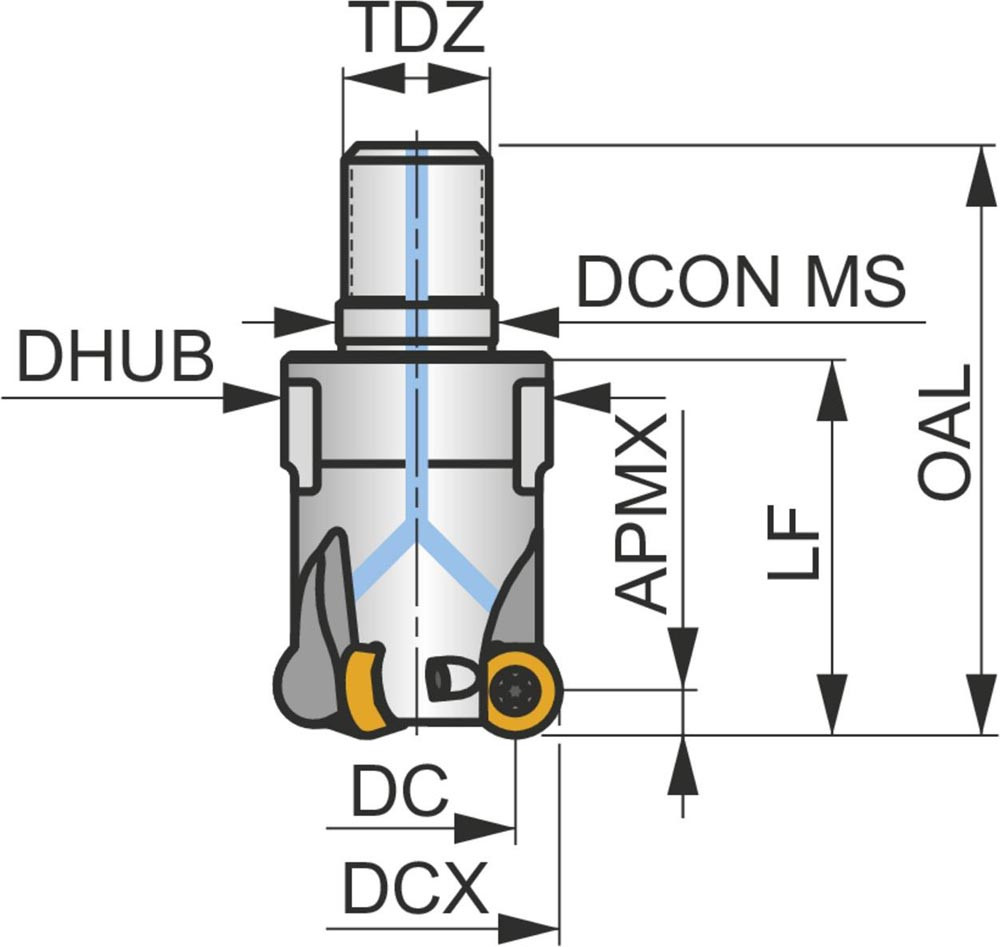 Kopier-Planfräser mit doppelt negativer Geometrie zum spannen von 3 Stück RCMT 10T3MO.. einseitigen Wendeschneidplatten · Schnittdurchmesser 25mm mit M12 Gewindeschaft für modulare Standardhalter · 32mm Überstandslänge · Kühlkanalbohrung zum Planfräsen · Kopierfräsen · Rampen · Helikalen Fräsen und progressiven Eintauchen mit einer maximalen Schnitttiefe von 5.0mm