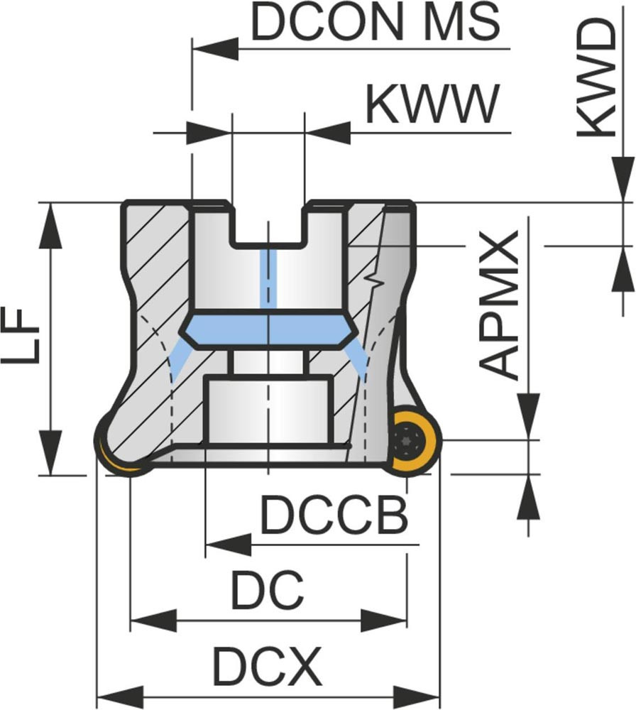 Kopier-Planfräser mit doppelt negativer Geometrie zum spannen von 5 Stück RCMT 10T3MO.. einseitigen Wendeschneidplatten · Schnittdurchmesser 40mm mit 16mm Verbindungsbohrung gemäß DIN 8030-A · 40mm Überstandslänge · Kühlkanalbohrung zum Planfräsen · Kopierfräsen · Rampen · Helikalen Fräsen und progressiven Eintauchen mit einer maximalen Schnitttiefe von 5.0mm