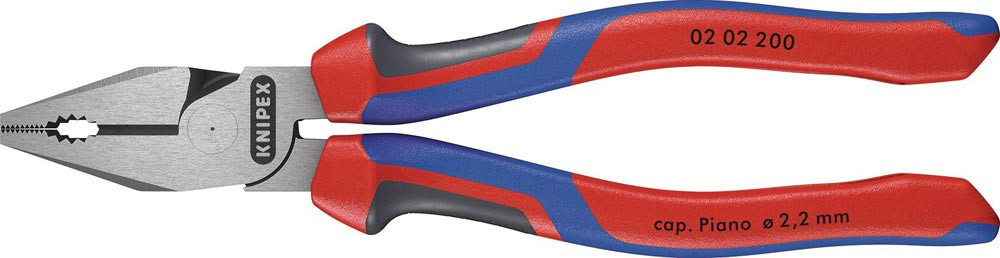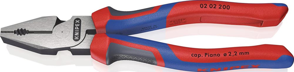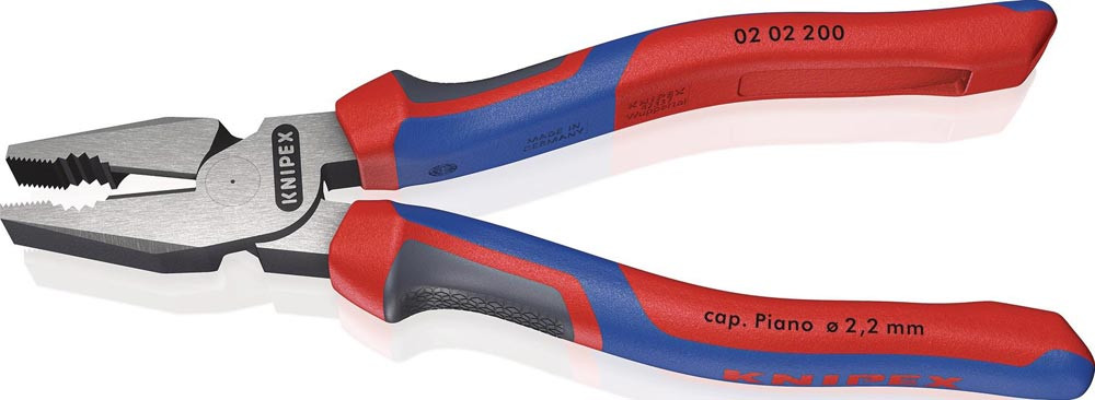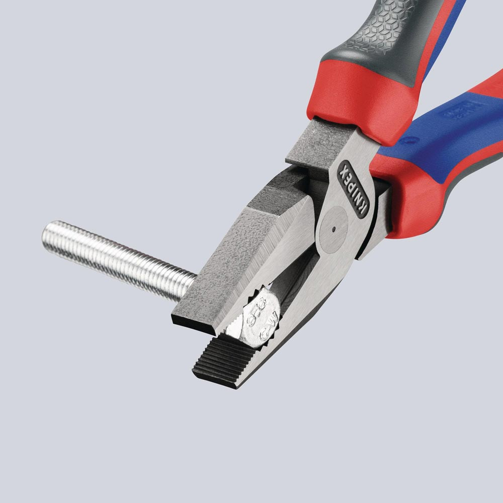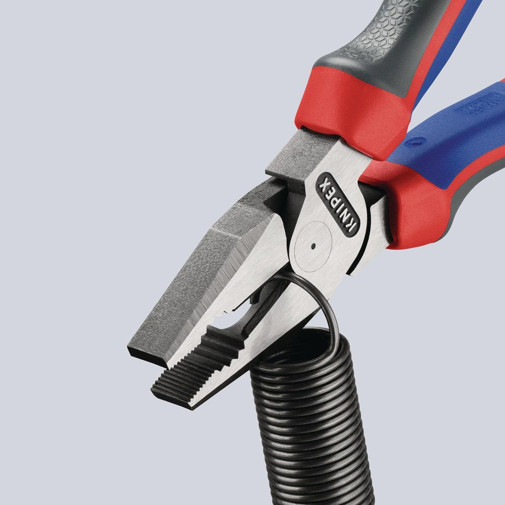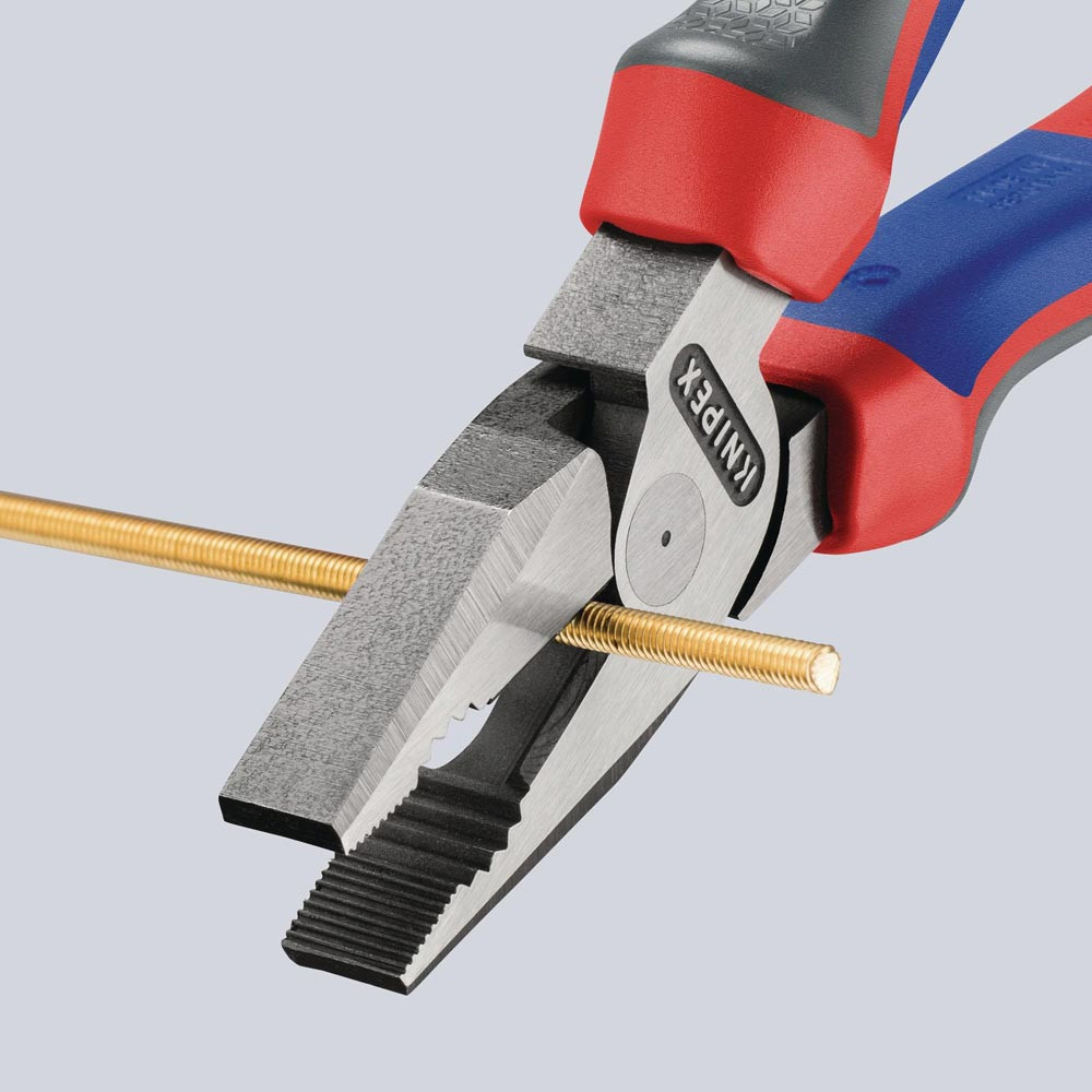 35 % Kraftersparnis gegenüber herkömmlichen Kombizangen · Greifzonen für Flach- und Rundmaterial · lange Schneiden für dickere Kabel · Schneiden zusätzlich gehärtet, Schneidenhärte ca. 63 HRC · Spezial-Werkzeugstahl in Sondergüte, geschmiedet, mehrstufig ölgehärtet