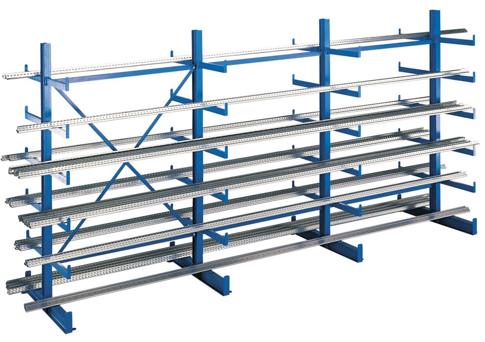 Kragarmregal-Set, doppelseitig, 3 Ständer, 6 Lagerebenen je Ständerseite, BxTxH 2500x1115x2000 mm, RAL 5010 enzianblau, Armlast 200 kg E823452