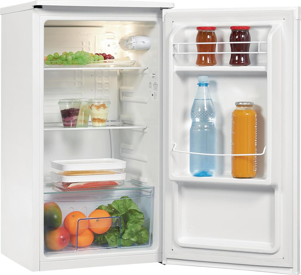 Vollraum-Kühlschrank · Energieverbrauch 106 kWh/Jahr · Nutzinhalt: 75 l · 2 Glasablagen, verstellbar · 2 Türfächer · 1 Gemüseschale mit Glasabdeckplatte