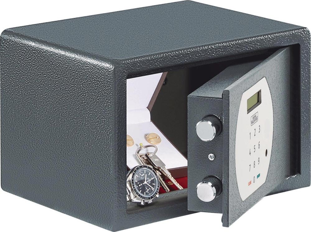 robuster einwandiger Korpus · Tür doppelwandig · verstärkte Riegelbolzen · Aufbohrschutz · für Wand- und Bodenbefestigung vorgerichtet (inkl. Befestigungsmaterial) · ideal für den Einbau in Schränke und andere Möbelstücke: Größe PS 130 mit Ordnertiefe · modernes, einfach programmierbares Elektronikschloss · Bequeme Handhabung durch motorgetriebene Verriegelung und automatische Türöffnung · verschiedene Öffnungsmethoden: Generalcode für den Hotelier · änderbarer Benutzercode für den Gast · verständliche Kurzanleitung für den Gast · haptisches Feedback bei Tastendruck · klares und gut lesbares Display · Batteriebetrieb mit 1,5 V Mignon (inklusive 4 Batterien)