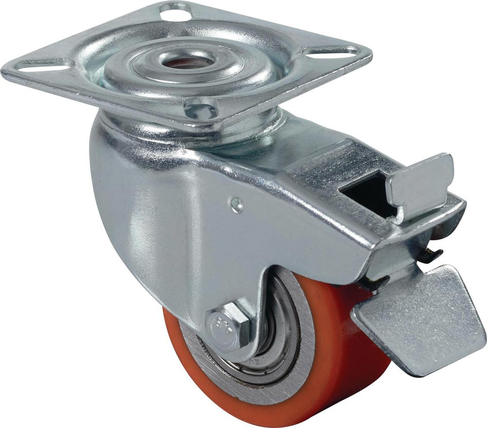 Gabel aus Stahlblech · zweireihiger Kugelkranz im Gabelkopf · Lauffläche Polyurethan 90+/-3 Shore A · niedrige Bauhöhe · hohe Tragkraft · Kugellager · sehr hoher Rollwiderstand und sehr hohe Verschleißbeständigkeit · mit Plattenbefestigung