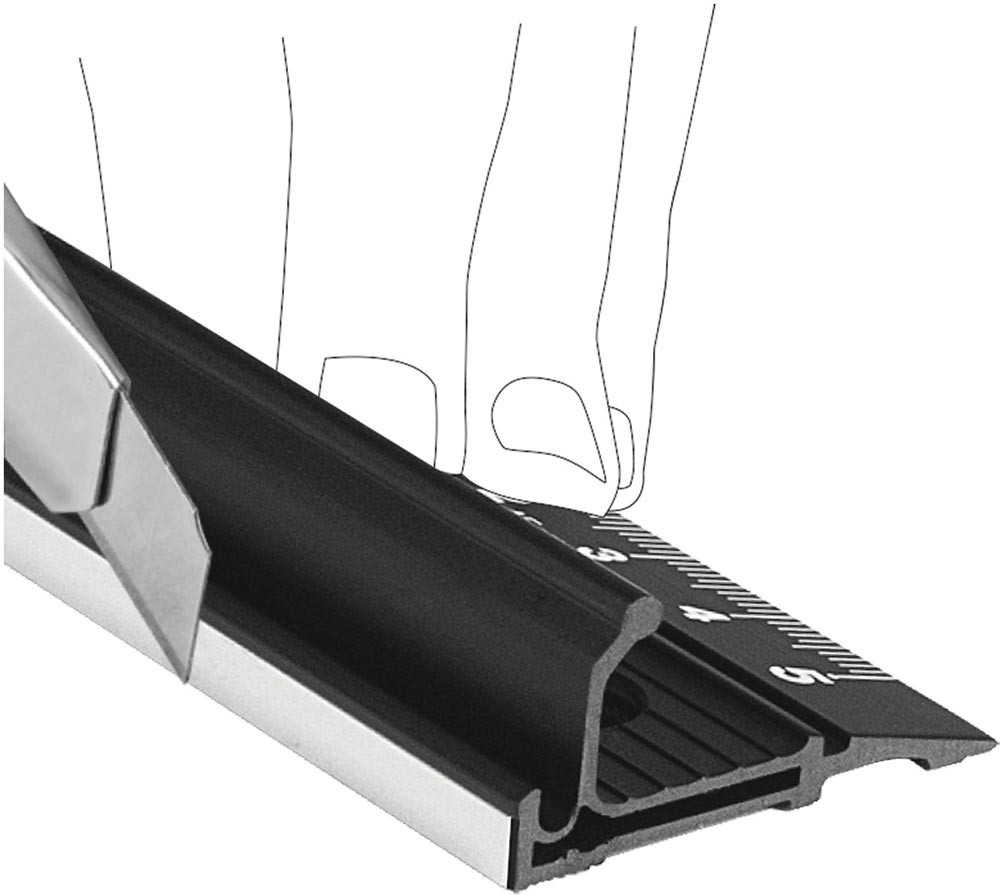Präzisionsskala · leichtes Aluminium-Strangpressprofil mit 18,5 mm hohem Fingerschutz und Edelstahlschiene als Ziehkante für Cutterklingen · mit rutschhemmendem Einsatz in der Sohle