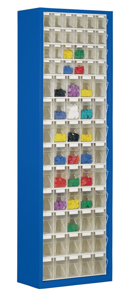 Magazinschrank, BxTxH 665x250x2000 mm, 69 Kästen, 24xGr. 6, 45xGr. 5, Gehäusefarbe RAL 5010 enzianblau