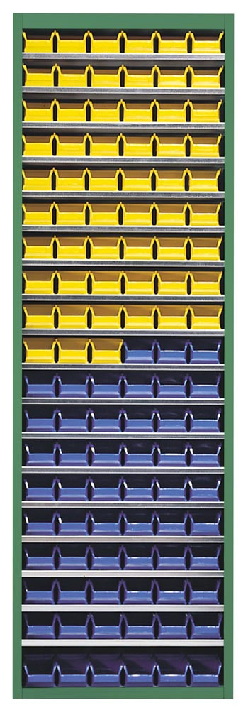 Magazinschrank, ohne Türen, RAL 6011 resedagrün, BxTxH 680x280x2150 mm, Anzahl Kästen: 57 xGr. 5 gelb, 57 x Gr. 5 blau