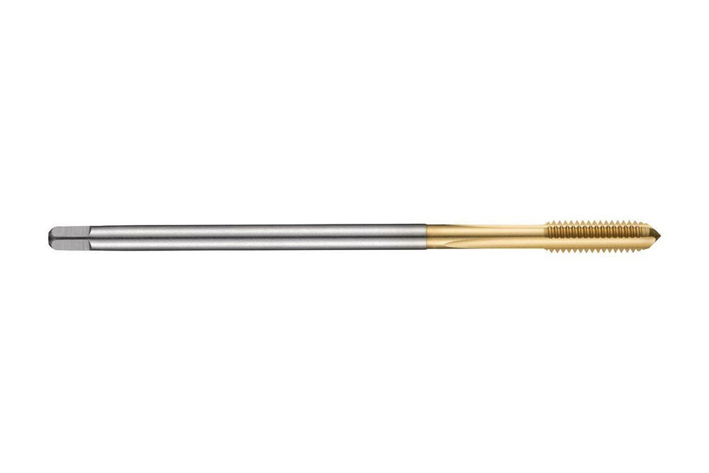 Gerade genuteter Gewindebohrer mit langem Schaft NO3 mit 2-3xP Gewindeanschnitt · ISO-Metrisches Gewinde M10 mit 1.50 mm Steigung und 6H Toleranzklasse · Abmessungen nach ISO 2283 Standard mit 8.0mm Schaft und 6.3mm Vierkantantrieb · HSSE-PM mit TiN Beschichtung 1.5xD Durchgangs- und Sacklochgewinde in Baustahl und Kohlenstoffstahl und Grauguss · Temperguss · duktiles und verdichteter Graphitguss