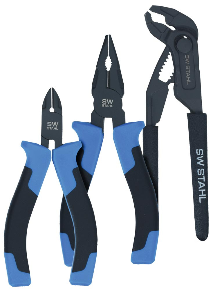 Praktisches Mini-Zangen-Set bestehend aus Kombizange (130 mm), Seitenschneider (110 mm) und Wasserpumpenzange (125 mm) ∙ Aus Chrom-Vanadium-Stahl und mit korrosionsbeständiger "Teflon Finish"-Oberfläche ∙ Greifzähne und Schneiden induktiv gehärtet ∙ Kombizange und Seitenschneider mit optimaler Hebelübersetzung für einfaches und ermüdungsfreies Arbeiten ∙ Wasserpumpenzange mit durchgestecktem Gelenk und Druckknopfverstellung