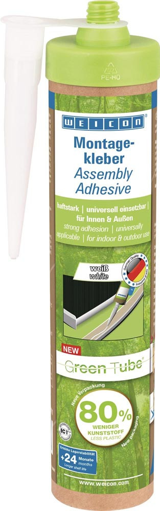 NEU: in der Green Tube®, die nachhaltige Verpackung als Alternative zur Plastikkartusche - insgesamt 80% weniger Kunststoff: Kartuschenkörper 100% aus Papier, Montagekleber im Alu-Schlauchbeutel, der Deckel aus Bio-Polymer und die Kartuschenspitze aus 100% recyceltem Kunststoff