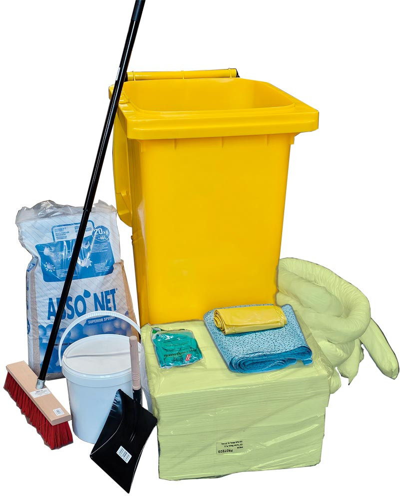 Nottfall-Set (Spezial) mit Tonne, Granulat, Tüchern, Granulat, Besen, Schaufel, Handschuhe, Säcke, BxTxH 730x570x1060mm
