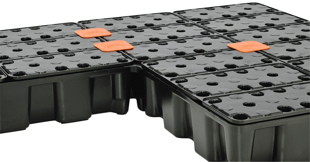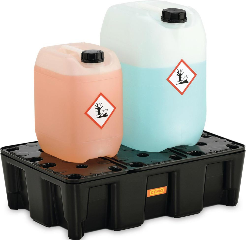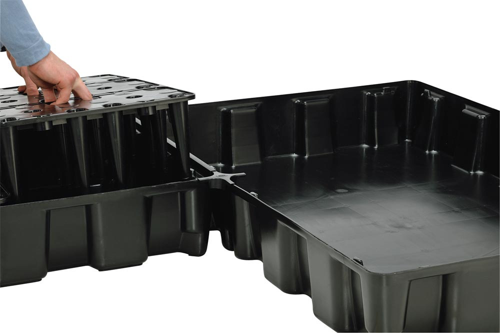 für Kleingebinde · zur sicheren und vorschriftsmäßigen Lagerung gewässergefährdenden Flüssigkeiten der GHS-Kategorien 1-4 · aus HD-Polyethylen · sehr beständig gegen Laugen, Öle und Säuren · stapelbar · rutschsichere Plattenoberfläche · konzipiert für Kombination auf Europalette · mit DIBT-Zulassung Nr. Z-40.22-548 und Z-40.22-549