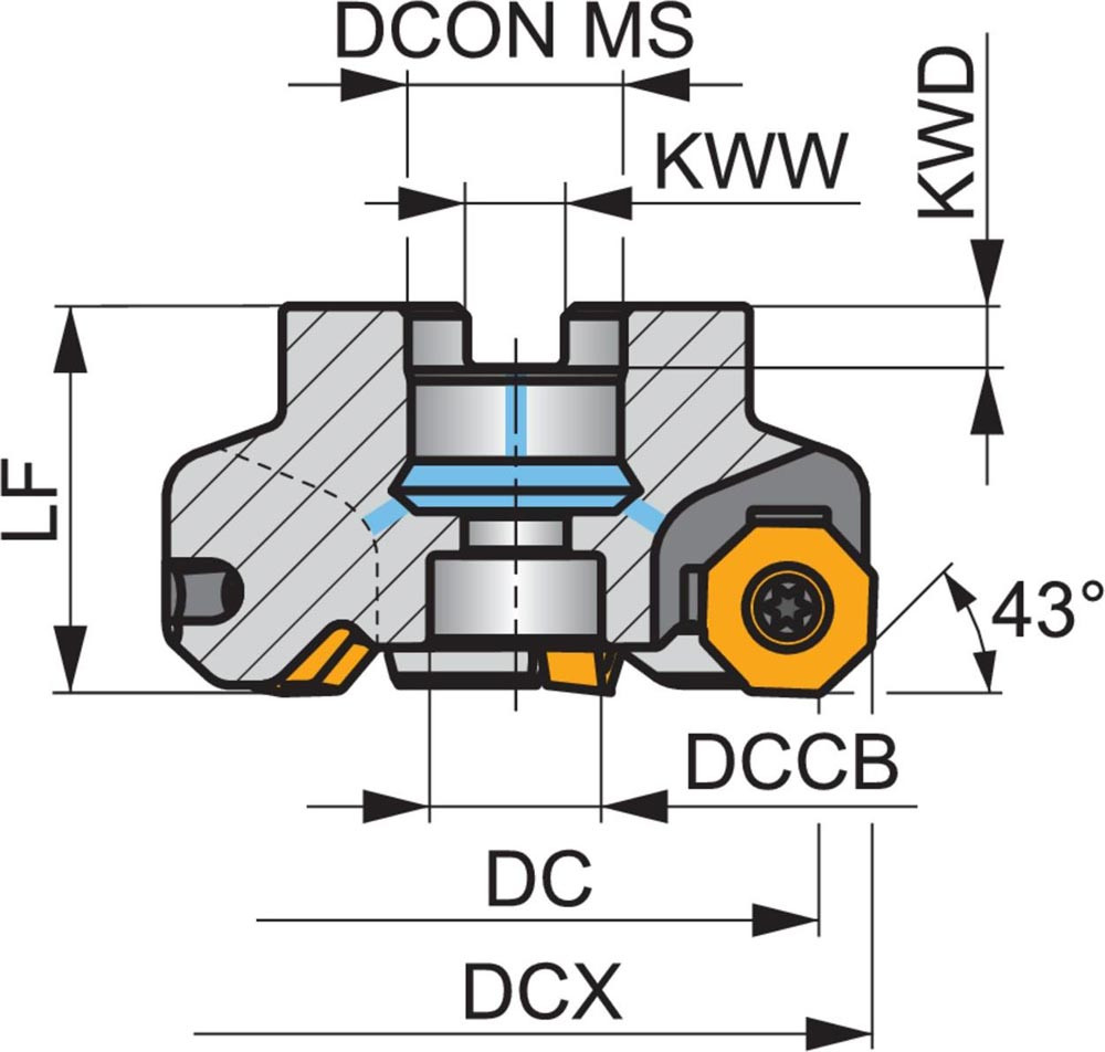 Planfräser mit doppelt negativer Geometrie welche 10 aus ONMX 0605.. · ONMX 0605..-W oder SNMX 1705.. doppelseitige Wendeschneidplatte · Schneiddurchmesser 100mm bis maximal 110,8mm mit 43° Anfahrwinkel und 32mm Bohrung gemäß DIN 8030-A · 50mm funktional und · durchgehende Kühlung zum Planfräsen und Entgratenmit einer maximalen Schnitttiefe von ON.. 4mm · SN.. 7mm