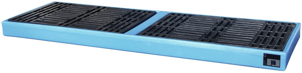 Polyethylen-Bodenschutzwanne, BxTxH 895x2610x150 mm, blau mit schwarzer PE-Palette, Volumen 300 l, Gewicht 48 kg, Traglast 2000 kg