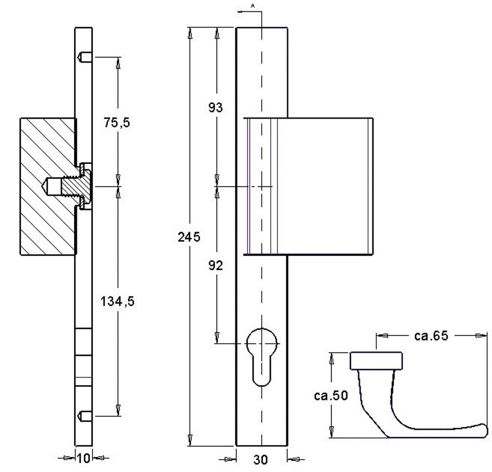 für Rahmentüren · Entfernung 92 mm · Vierkant 8 mm · PZ-gelocht · Drücker fest-drehbar gelagert · massive Schilder · eckig · Stärke 10 mm · Höhe 245 mm · Breite 30 mm · Verschraubung von innen nach außen · innen sichtbar verschraubt · für Türstärke 68-75 mm · DIN links / rechts · Lieferung inkl. Stift und Schrauben