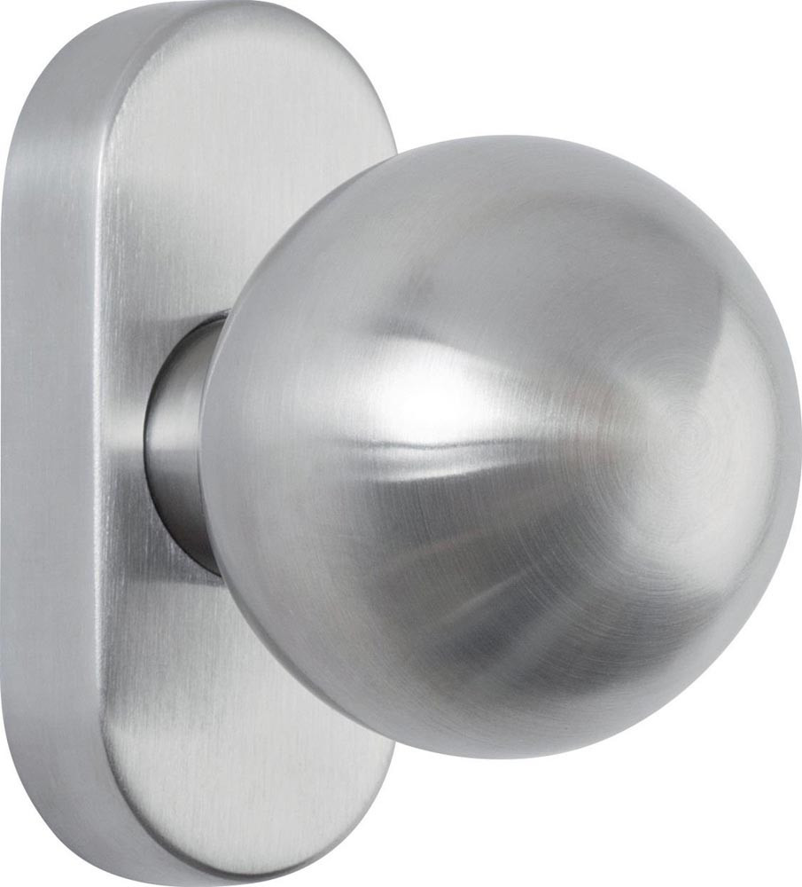 Kugeltürknopf · gekröpft · fest oder drehbar auf Ovalrosette · Schraublochung 6 mm · Knopflochteil mit 8 mm Vierkantlochung · Knopf fest montiert mit M12 Innengewinde für den Einsatz von Standard-Wechselstiften mit Rolle · Die Version „fest“ ist auch für Brandschutztüren zugelassen.