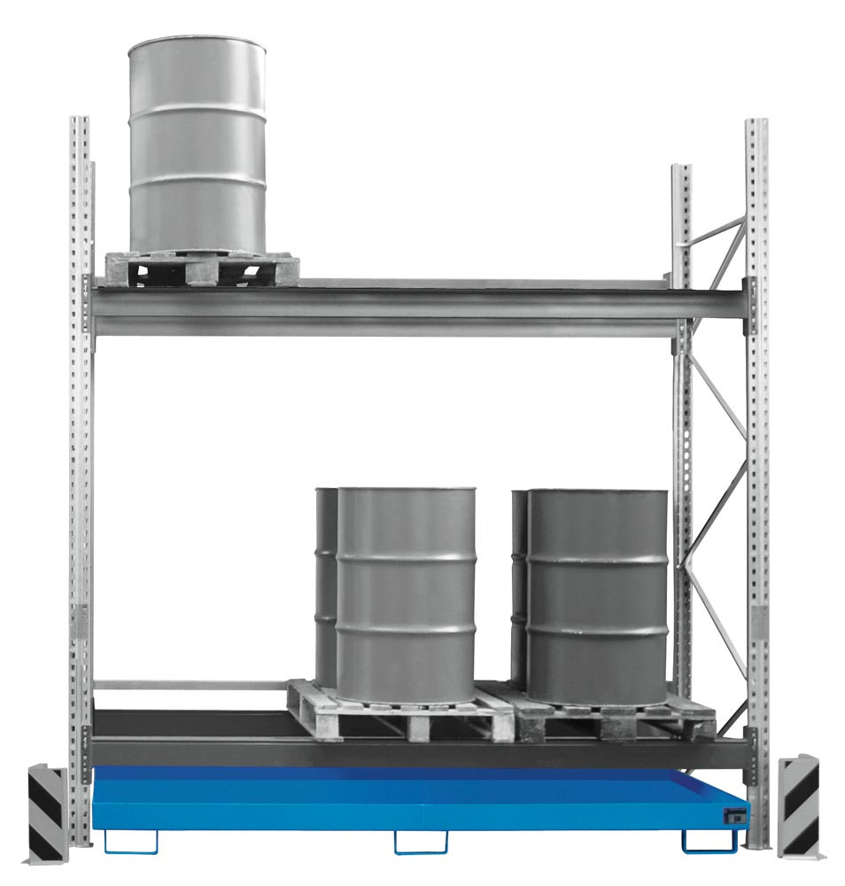 ∙ Mit Hilfe von Regalwannen können auch bestehende Regalsysteme wirtschaftlich und schnell gesetzeskonform umgerüstet werden ∙ Aus 3 mm Stahlblech ∙ 100 mm Unterfahrhöhe ∙ Wannentiefe 1300 mm
