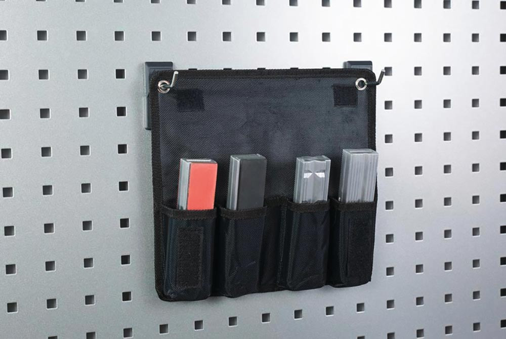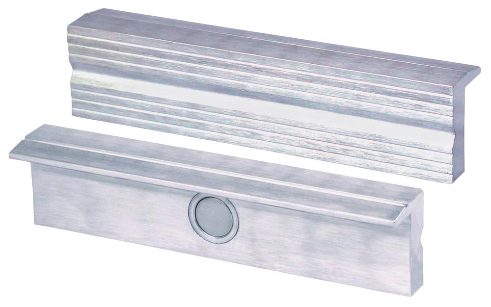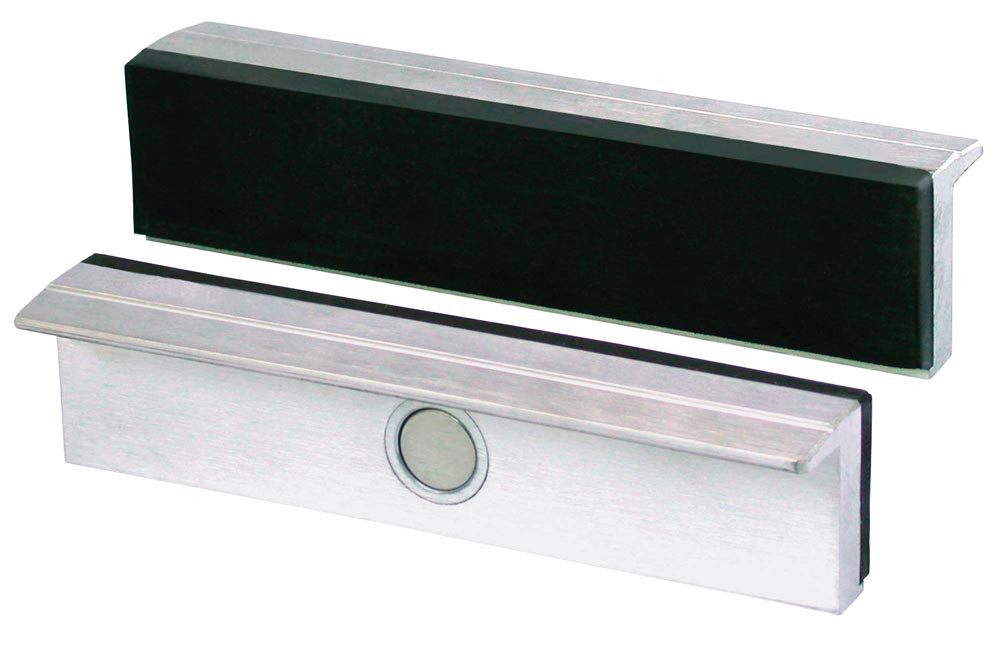 aus Aluminium · mit äußerst kräftigem Neodym Flachmagnet, welcher fest in der Backe verpresst ist und sich auch nach langer Benutzung nicht löst · der Magnetismus dringt nicht zu der vorderen Spannfläche vor · passend für alle Schraubstocktypen · verpackt in hochwertiger Tasche mit Ösen zum Aufhängen z.B. an eine Lochwand