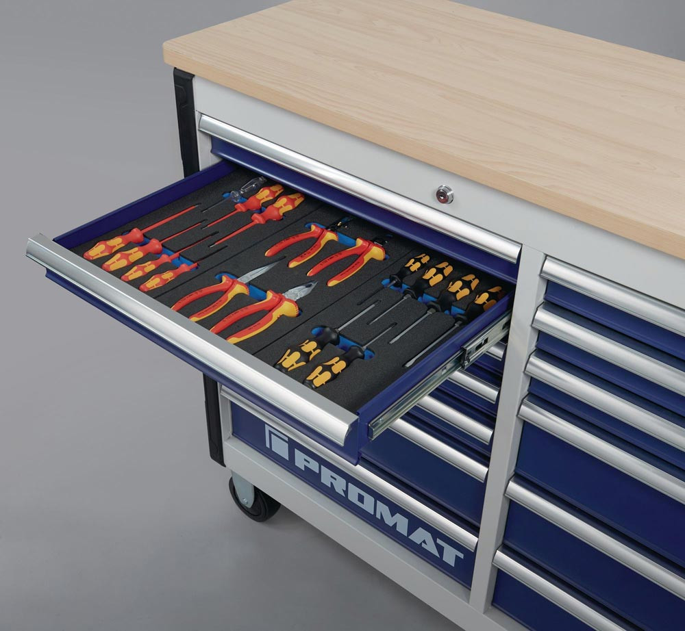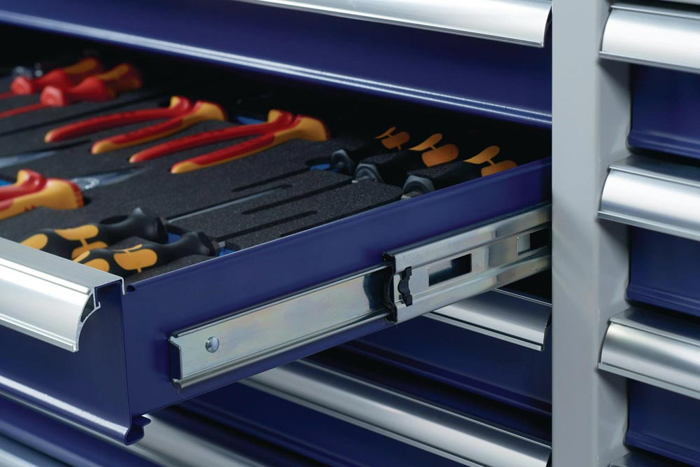 mit 13 Schubladen · Handgriff · kugelgelagerten, mit Teleskopschienen herausziehbaren Schubladen mit 100 % Auszug mit jeweils einer Antirutschmatte · automatischer Schubladeneinzug · beschriftbare Schubladen · robuste Ablagefläche bestehend aus einer 25 mm dicken MDF Platte · Einteilerset für 4 Schubladen im Lieferumfang enthalten · mit Zentralverriegelung (nur eine Schublade gleichzeitig geöffnet) · abschließbar mittels eingebauten Zylinderschloss mit 4 Schlüsseln · hochwertige PVC-Rollen Ø 127 mm - 2 starre und 2 lenkbare Rollen mit Feststellung · beidseitiges Lochwandsystem (9 x 9 mm) · für einfache Installation von Zubehörartikel · 2 Dosenhalter mit Lochung für Schraubendreher (im Lieferumfang enthalten) · durchgehender, seitlicher Kantenschutz