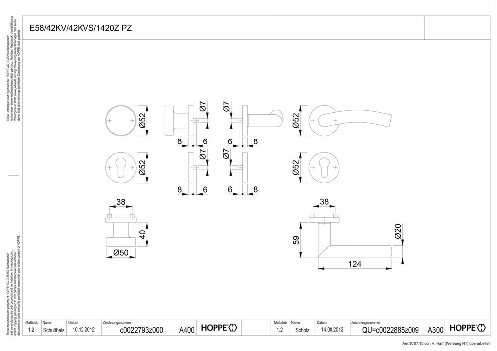 Rosetten-Garnitur mit Schlüsselrosetten · geprüft nach DIN EN 1906: 37-0140A (Gebrauchs-Kategorie Klasse 3), Objekt-Garnitur · Lagerung: Türgriffe lose, Rückholfedern rechts/links verwendbar , wartungsfreie Gleitlager · mit Schnellstift-Verbindung bei D/D mit HOPPE-Vollstift (Loch-/Lochteil), bei K/D mit HOPPE-FDW-Vollstift (Lochteil)· Unterkonstruktion: Kunststoff, Stütznocken · Befestigung: verdeckt, durchgehend, wechselseitig, Mehrzweckschrauben