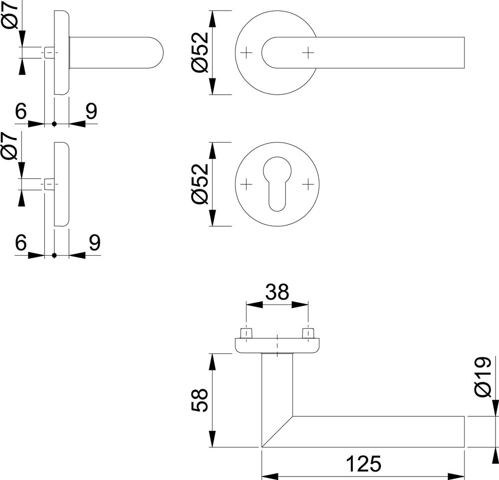 Innentür-Rosetten-Garnitur · Türgriffe mit Profilstift-Verbindung (8 mm Vierkant) für Türstärke 38-42 mm und Rückholfeder · Rosetten mit Stütznocken unsichtbar verschraubt · Anschlagrichtung DIN links / rechts