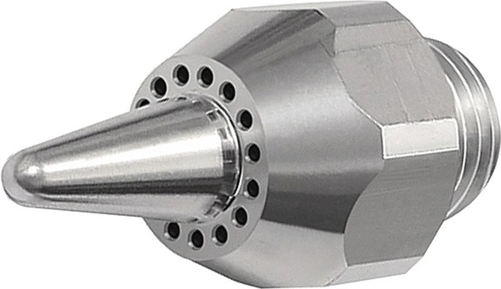 für Blaspistole in Standardausführung · mit diesen lärmreduzierenden Düsen wird bei korrekter Auslegung, im Vergleich zu herkömmlichen Einlochdüsen, bei gleicher Blaskraft ein niedriger Geräuschpegel erreicht · sie sind überwiegend mit einem lärmmindernden Kunststoffeinsatz bestückt und werden vom Berufsgenossenschaftlichen Institut empfohlen