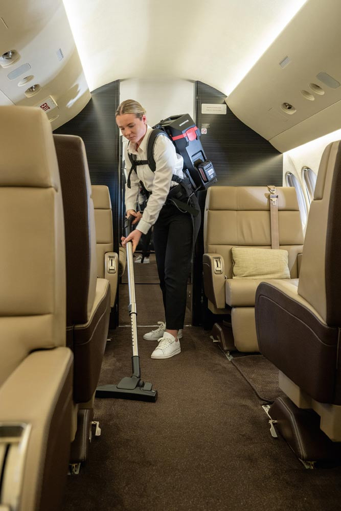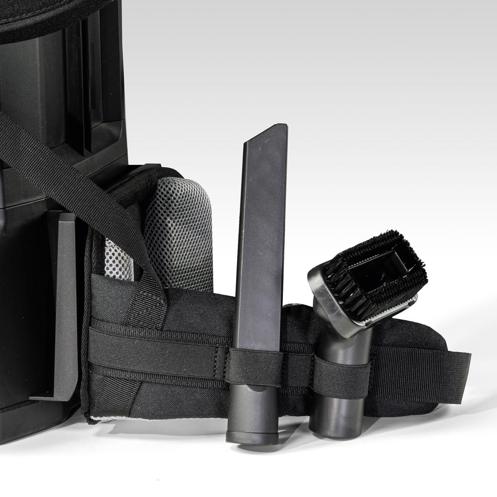 Kabelloser Rucksacksauger mit äußerst niedrigem Gerätegewicht von nur 4,4 kg ∙ Mit bürstenlosem 300 Watt EC-Motor ∙ Mit einer Laufzeit von bis zu 90 Minuten eignet sich das Gerät ideal für lange Arbeitseinsätze in beengten oder schwer zugänglichen Bereichen wie öffentlichen Verkehrsmitteln, Kino- und Theatersälen oder Treppenhäusern ∙ Dreifaches HEPA 13-Filtersystem sorgt für eine saubere Ausblasluft, geeignet für Gesundheitswesen und Kindergärten