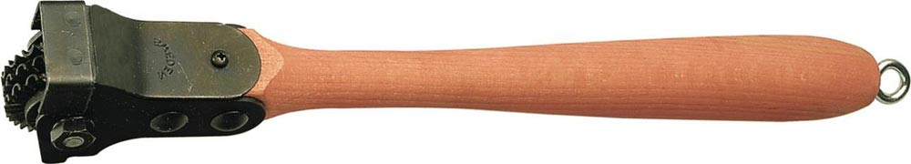 stabiles Griffstück aus Edelholz für festes, bequemes und beidhändiges Zupacken · Stütznasen zur Erleichterung, gleichmäßiges Anlegen der Rolle an die Schleifscheibe · zur Vereinfachung seitlicher Bewegungen, um die gesamte Breite der Schleifscheibe abzurichten · Schutzblech zur Verhinderung sprühender Funken gegen Gesicht und Hände