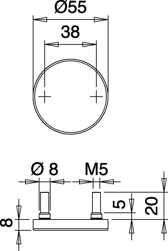rund · auf Stahlunterkonstruktion · aus Edelstahl · Rosetten-Ø 55 mm · Rosettenstärke 8 mm · Nockenabstand 38 mm · unsichtbare Verschraubung · für Türstärke 40-65 mm · WC für Türstärke 40-48 mm