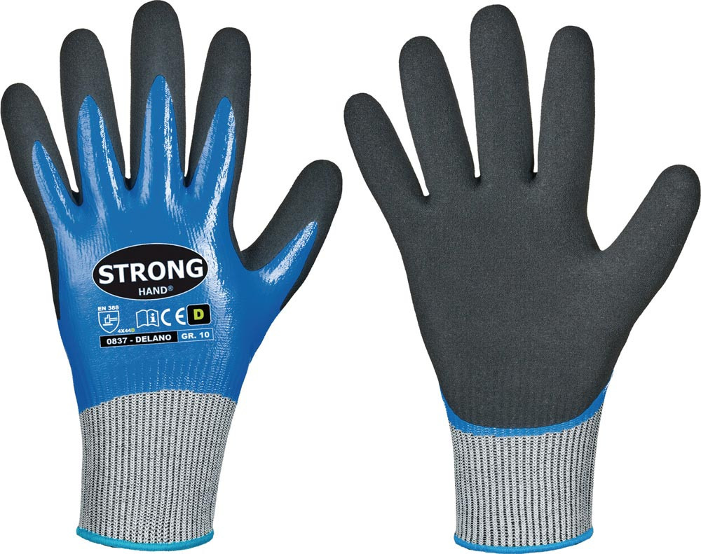 nach EN 388 · Kat. II · Material: Polyethylen (HDPE)/Polyamid/Glasfaser/Elastan mit doppelter Nitrilbeschichtung: 1. Beschichtung: vollbeschichtet, glatt, dunkelblau · 2. Beschichtung: Handinnenfläche, gesandet, schwarz · Premium-Qualität · nahtlos gestrickt · Schnittschutzlevel nach EN ISO 13997, Level D · doppelter Schutz durch doppelte Beschichtung · exzellente mechanische Beständigkeiten · optimaler Griff auch in öliger Umgebung · gute Beständigkeit gegen Öle und Fette · Anwendung: Elektronik-, Montage-, High-Tech- und Pharmaindustrie, Entsorgung, Autoindustrie