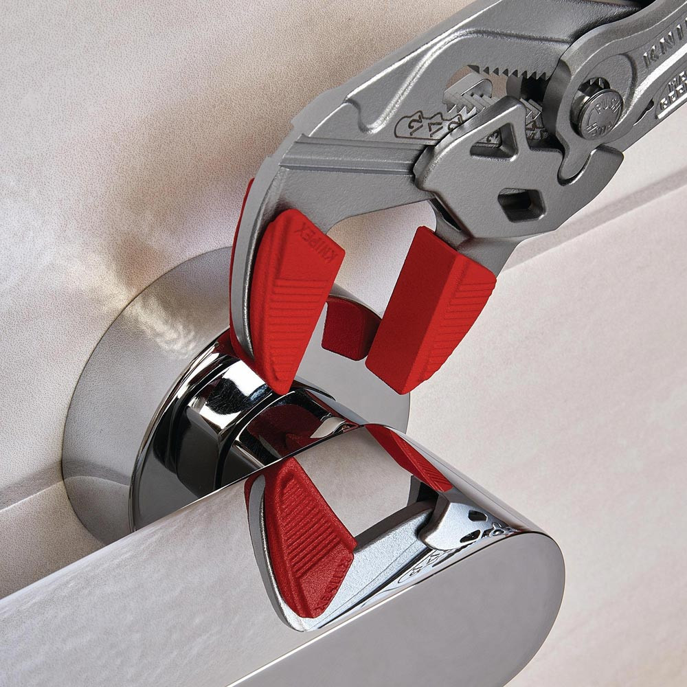 für KNIPEX Zangenschlüssel · geeignet für Designarmaturen und weitere höchstempfindliche Materialien dank weicher, glatter Greifflächen · beschädigungsfreies Greifen, Halten und Pressen · Set bestehend aus 3 Paar Schonbacken aus Kunststoff