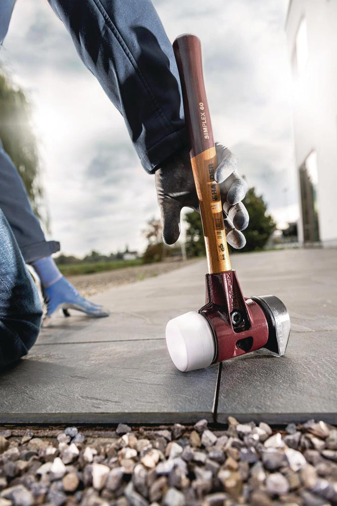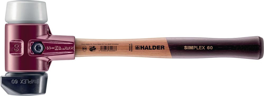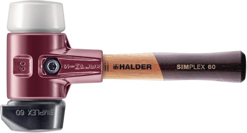 2-teiliges Spanngehäuse aus Temperguss · Schlageinsätze und Simplex-Stiel sind leicht auswechselbar durch Lösen bzw. Spannen der Innensechskant-Spannschraube · Schlagköpfe abriebfrei · mit je 1 Stück aus Gummikomposition, schwarz, mit Standfuß (mittelhart) und Gummikomposition, schwarz (mittelhart) · verschleißarm · Anwendungsbereiche: