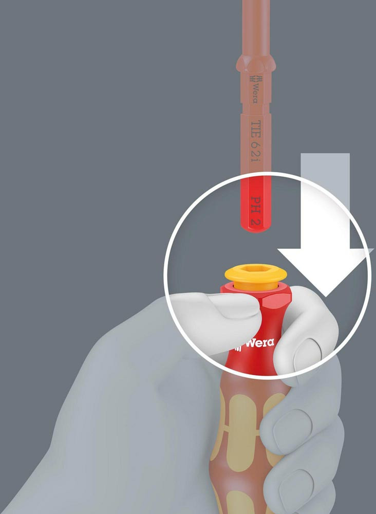 mit 14 VDE-Wechselklingen und Handhalter 817 VDE Kraftform (Quergriffform) und Werkzeugfinder "Take it easy" · mit reduziertem Klingendurchmesser mit integrierter Schutzisolation · IEC 60900 (Stückprüfung bei 10.000 V) · für sicheres Arbeiten bei der zugelassenen Spannung von 1.000 V · mit einpoligem Phasentester · in robuster Textil-Gürteltasche