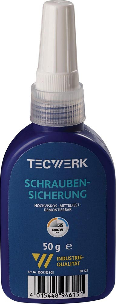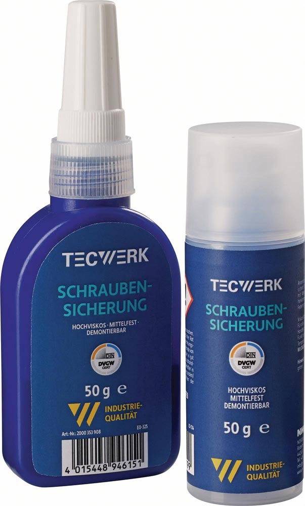 mittelfest, hochviskos · ein 1-komponentiger anaerober Flüssigkunststoff, härtet bei Kontakt mit Metallen unter Luftausschluss aus · ersetzt herkömmliche Befestigungsmethoden wie Splinte, Federringe und Scheiben · handfest nach ca. 10 bis 20 Min. · funktionsfest nach 1 bis 3 Std.· Viskosität: 2.000 bis 7.500 mPas (25 °C) · Spaltfüllvermögen: 0,25 mm · max. Gewinde: M 36 · Festigkeitsklasse DIN 30661:2 · Losbrechmoment: 17 bis 22 Nm · Temperaturbereich von -55 °C bis +150 °C · klebt, dichtet und sichert Schraubverbindungen, Fügeteile, Lager und Rohrverbindungen einfach, sicher und dauerhaft · mit DVGW-Freigabe für den Trinkwasserbereich