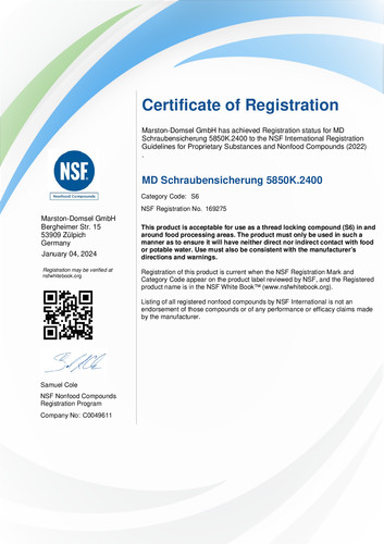 mittelfest, hochviskos · klebt, dichtet und sichert Schraubverbindungen, Fügeteile, einfach, sicher und dauerhaft · ersetzt herkömmliche Befestigungsmethoden wie Splinte, Federringe und Scheiben · sichert Schrauben, Muttern und Stehbolzen gegen das Losdrehen durch Vibrationen und dichtet gleichzeitig ab · Temperaturbeständigkeit von -55 °C bis +150 °C · kennzeichungsfrei · einfaches und punktgenaues Dosieren · kein Tropfen oder Nachlaufen · NSF S6 registriert (Reg.-Nr. 169275)