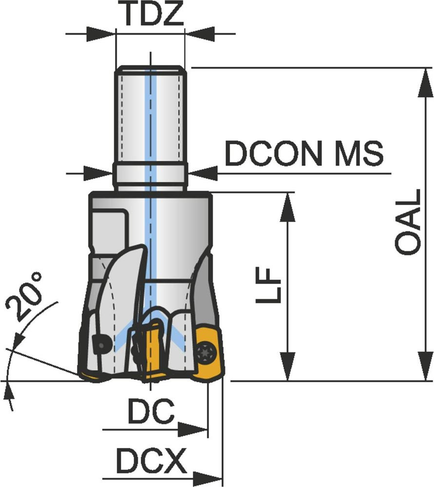 Hochvorschubfräser mit positiver/negativer Geometrie zum spannen von 2 Stück BNGX 10T3.. oder ANHX 10T3.. Wendeschneidplatten · Schnittdurchmesser 18mm mit 20° Anstellwinkel und M8 Gewindeschaft für modulare Standardhalter · 25mm Überstandslänge · Kühlkanalbohrung zum Planfräsen · Kopierfräsen · flachen Schulterfräsen · Rampen · Helikalen Fräsen · Tauchfräsen und progressiven Eintauchen mit einer maximalen Schnitttiefe von 1.0mm