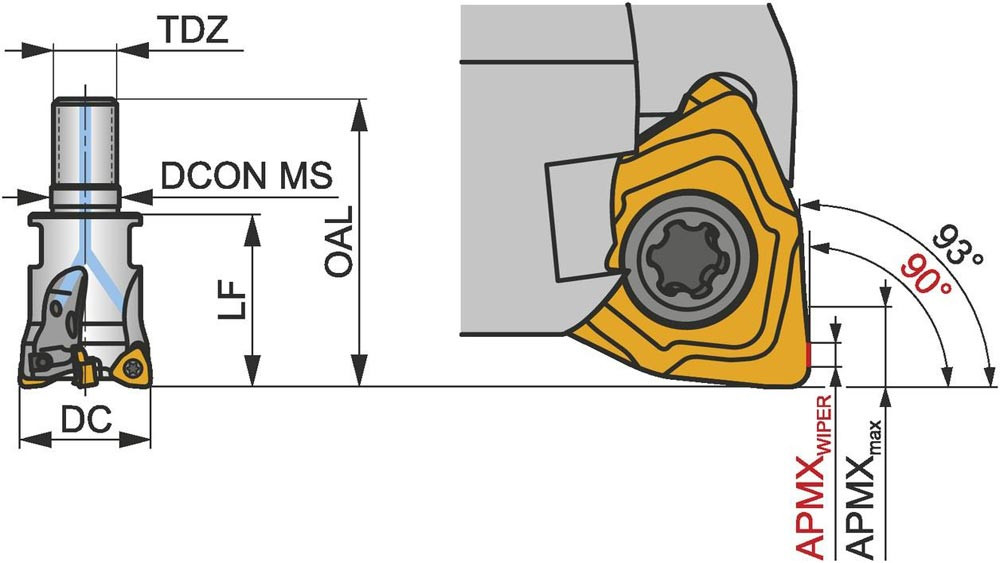 Kopier-Planfräser mit doppelt negativer Geometrie zum spannen von 6 Stück WNHX 0403.. doppelseitigen Wendeschneidplatten · Schnittdurchmesser 32mm mit 93° Anstellwinkel und M16 Gewindeschaft für modulare Standardhalter · 40mm Überstandslänge · Kühlkanalbohrung und ungleiche Teilung zum Planfräsen · Kopierfräsen · flachen Schulterfräsen · tiefen Schulterfräsen · Rampen und Tauchfräsen mit einer maximalen Schnitttiefe von 0.5mm