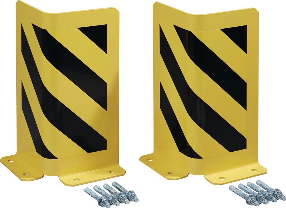für Regalsysteme im Eck- und Durchfahrtsbereich · aus gekantetem Stahlblech, Stärke 5 mm · L- oder U-Form · pulverbeschichtet zinkgelb, RAL 1018, mit schwarzen Warnmarkierungen · Ausführung nach BGR 234 · inkl. Bodenanker zur Befestigung auf Betongrund · VE = 2 Stück