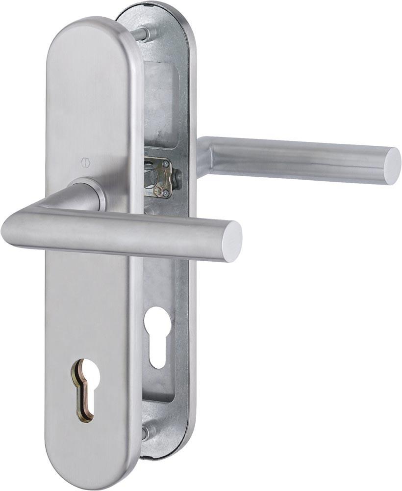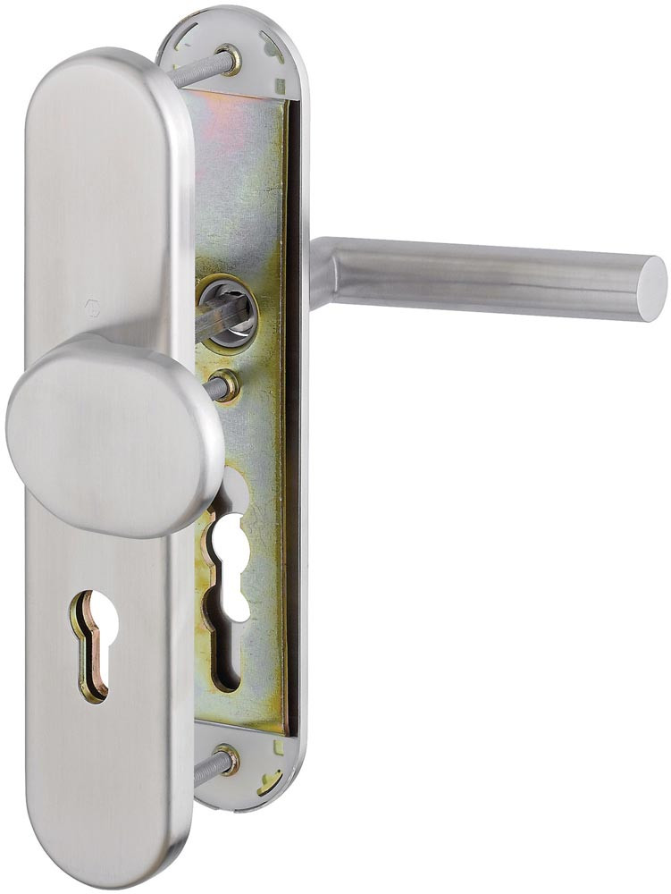 für Abschlusstüren · einbruchhemmend nach DIN 18257 · Stahl-Unterkonstruktion im Außen- und Innenschild · mit Rückholfeder-Paket · mit Schnellstift-Verbindung · hochfeste, verdeckte Verschraubung · Lochung PZ · DIN links / rechts · einschließlich Befestigungsmaterial · Widerstandsklasse ES 1