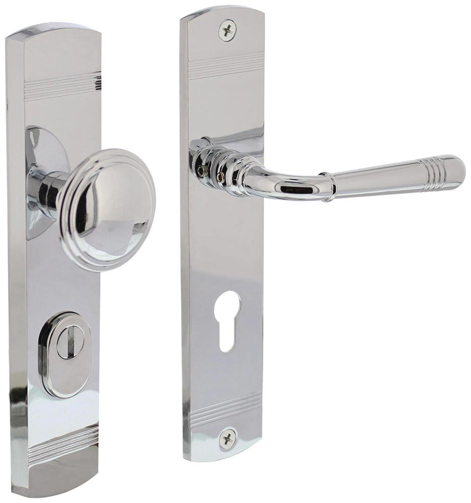 auf einem rechteckigen Schild · aus einer Zinklegierung gefertigt und mit einer messingfarbenen PVD-Beschichtung versehen, dadurch weniger anfällig für Korrosion · der Haustürbeschlag verfügt über einen Kernziehschutz, der den Zylinder vor dem Herausziehen und Aufbohren schützt · das Set besteht aus einem Außenknauf und einem passenden Griff für die Innenseite der Tür · links als auch rechts verwendbar · ist mit Laschen versehen, die ihm einen besseren Halt geben · das Schild federbelastet, so dass der Türgriff nach der Benutzung wieder in die waagerechte Position zurückspringt und für ein griffbetätigtes Mehrfachschloss geeignet ist · für Türstärke 38-42 mm · inkl. Befestigungsmaterial für die Montage